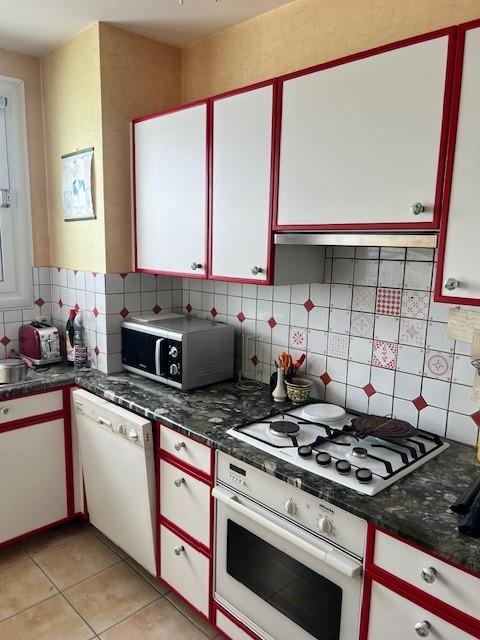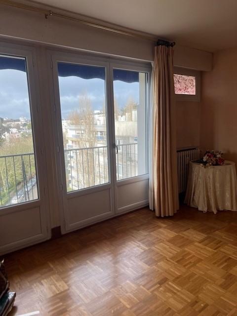 Au 6ème étage, vue dégagée, appartement de 86m2, exposé est-ouest : entrée avec placard, salle à manger et salon sur parquet, cuisine exposée est, buanderie, deux chambres avec balcon, salle d'eau, wc.